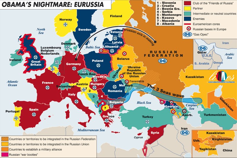 The map illustrates the ways in which the new American presidential administration will have to strike up relationships with Europe. The most worrying element is the increasing Russian influence in the "old continent" because of its role as major gas supplier to the European countries. Putin and Medvedev are elaborating a plan called "Russia Project" aiming to reintegrate some territories in the Russian Federation and the creation of a Russian Union. Russia can rely on a "Friendly Club" led by Germany. In order to face this strategical threat, the United States can rely for support on the enemies of EuRussia notably Great Britain and some of the baltic nations.