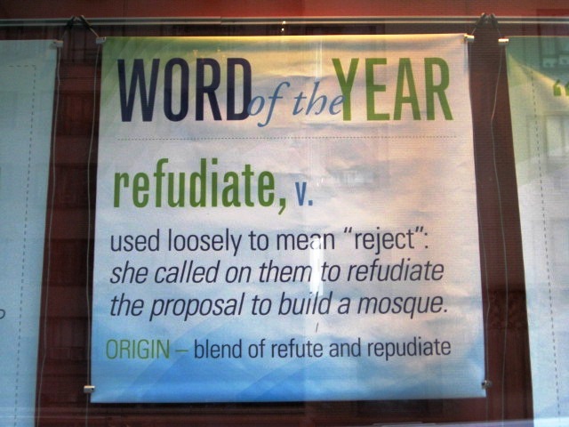 Being a word lover I adore' refudiate'. The good folks at the press chose wisely and showed that they are freely engaged in the world of ideas and ignoring politically correct restraints. Especially in the context of Sarah Palin's famous tweet about the Ground Zero Mosque.