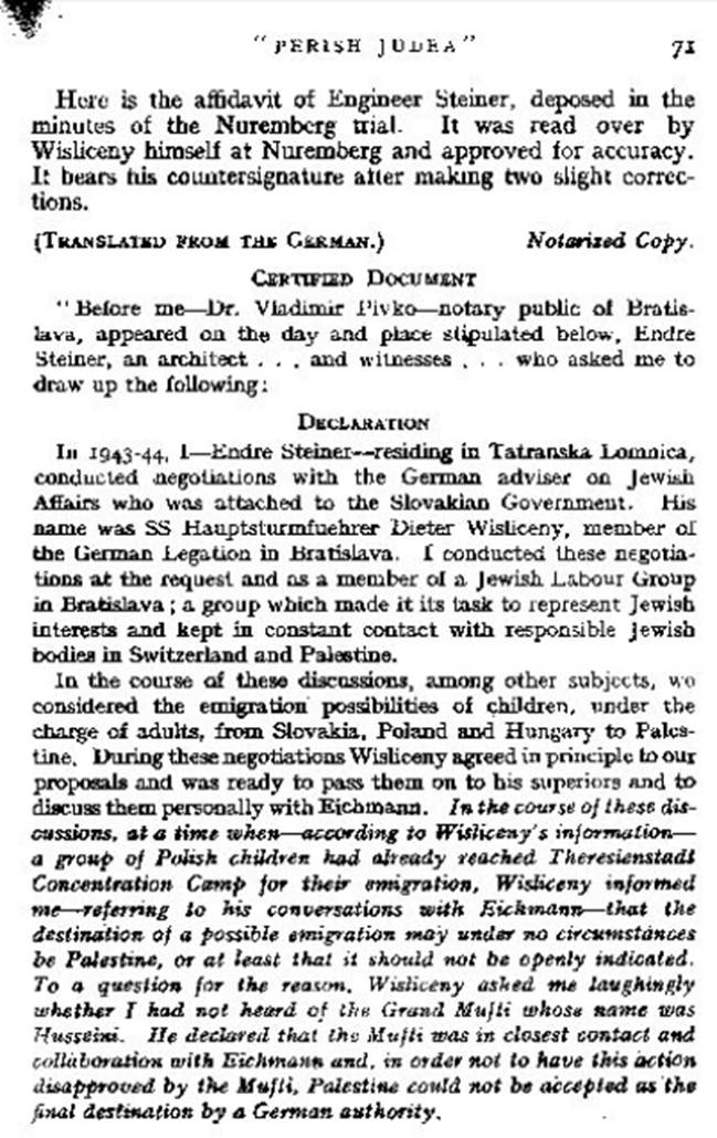 As part of the legal proceedings at the Nuremberg War Crimes Tribunal, two independent witnesses (Andrej or Endre Steiner and Rudolf Kasztner)—both of whom had had personal contact with DieterWisliceny during the war—reported to the Tribunal that in wartime conversations with Wisliceny he had said certain things about Husseini’srole in the Final Solution (the genocidal enterprise in which Wisliceny was not just anybody but a highly-placed administrator). The Steiner and Kasztner testimonies are quite similar to each other. Before his execution for crimes against humanity, Nuremberg Tribunal investigators called onWisliceny to either confirm or deny what these two independent witnesses had said. Wisliceny did correct them on minor points but he confirmed what they had both stated concerning Husseini’s central and originating role in the extermination program (consult footnote [3] to read the Steiner and Kasztner testimonies).
